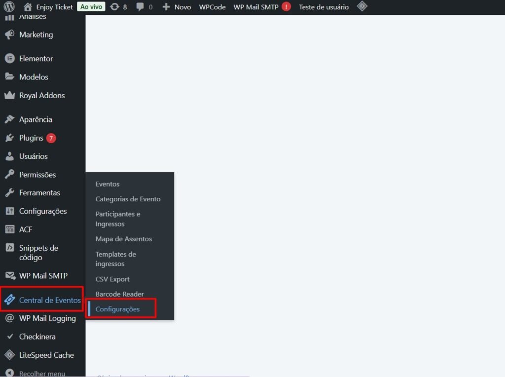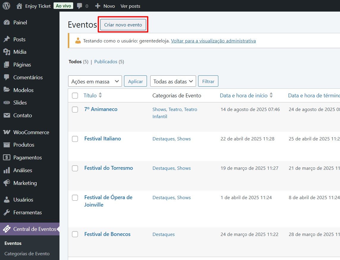 Acesse “Central de Eventos” > Eventos > Criar Novo (no topo superior esquerdo)