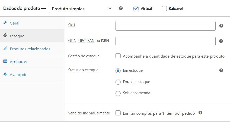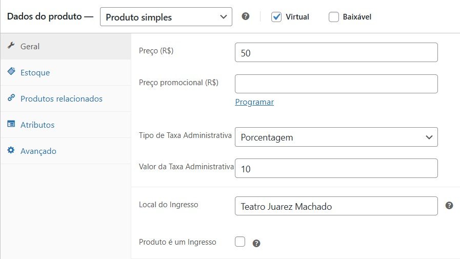 Ao lado de “Dados do produto” escolha a opção “Produto simples” para ingressos (ou atrações, como mencionamos mais acima) que não tem variações no preço do ingresso como “inteira” ou “meia”.
