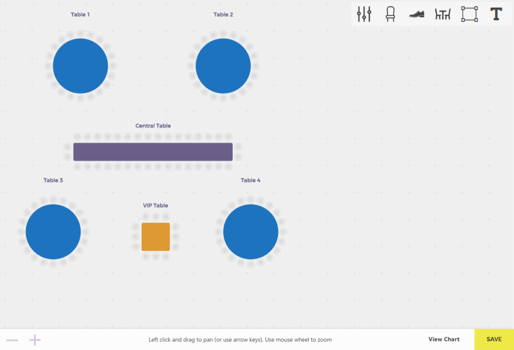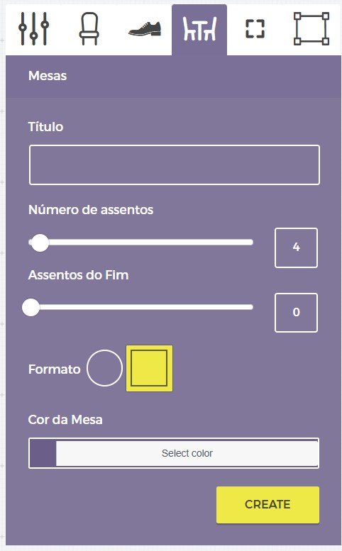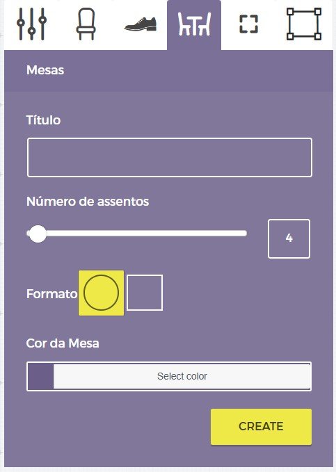 Este painel será muito útil se você estiver organizando um evento que inclua assentos ao redor das mesas. Neste painel, você pode inserir o título da sua mesa, selecionar o número de assentos (usando o controle deslizante ou inserindo o número exato), selecionar o formato da mesa (redonda ou retangular) e definir uma cor da mesa (isso não afeta a cor dos assentos).