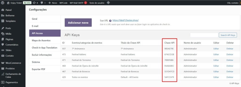 Para ver a chave API do evento vá em Central de Eventos > Configurações > API Access