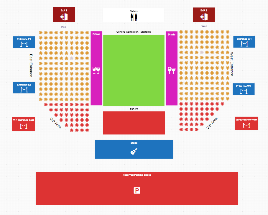 Para criar uma área de pista é fácil: selecione o painel da área de pista, no qual você pode selecionar o tipo de ingresso ao qual esta área deve ser associada. Claro, assim que você selecionar o tipo de ingresso desejado, esta área mudará para a cor selecionada para esse tipo de ingresso.