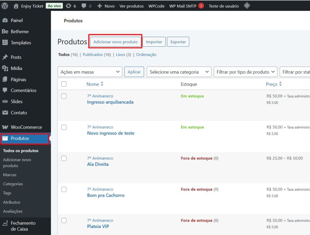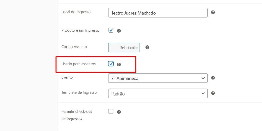 Primeiro você deve criar todos os ingressos/produtos como vimos mais acima, sempre marcando a opção “usado para assentos