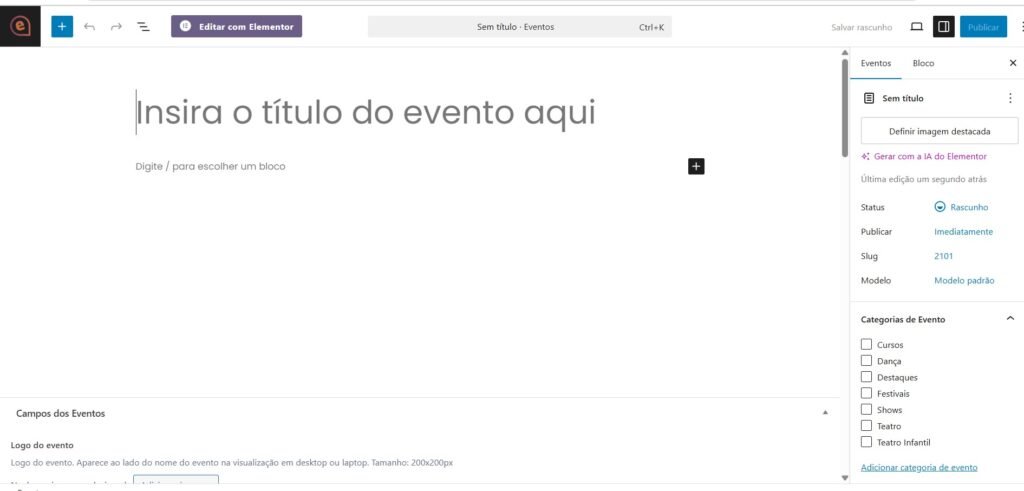 Depois cadastre o título do evento e abaixo em “Digite / para escolher um bloco” adicione as informações do evento.