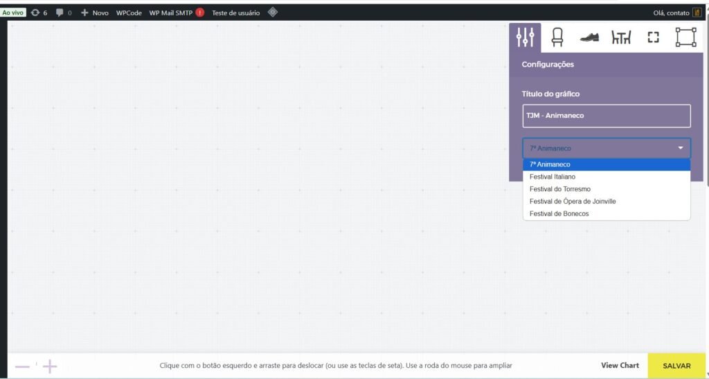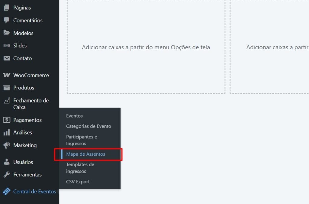Depois acesse central de eventos > mapas de assentos > criar novo mapa de assentos.