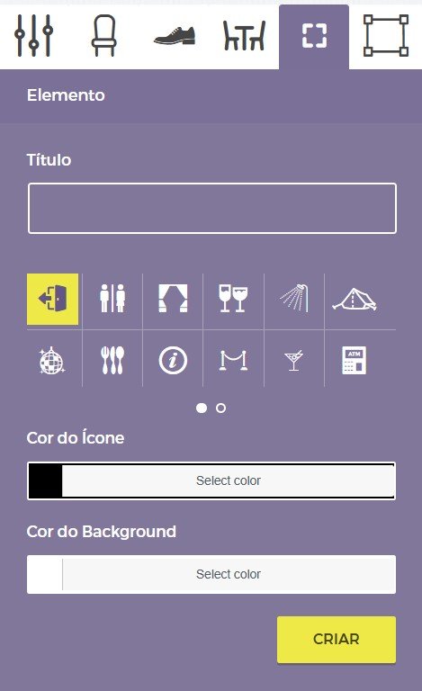 O painel Elementos permitirá que você selecione entre muitos dos elementos disponíveis e coloque-os na tela do gráfico de assentos. Isto pode ajudar muito a visualizar o layout do local e também pode servir como um “mapa” de uma certa forma para que os participantes saibam onde, por exemplo, está localizado o palco, onde estão as entradas, áreas de estacionamento, banheiros, pistas de dança, áreas de camping, etc.