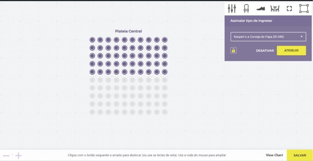 Acabamos de criar um grupo de assentos, que ainda não faz nada até atribuirmos algum tipo de ingresso a ele. Para fazer isso, você deve clicar e segurar o botão esquerdo do mouse e selecionar os assentos que deseja atribuir a determinado tipo de ingresso.