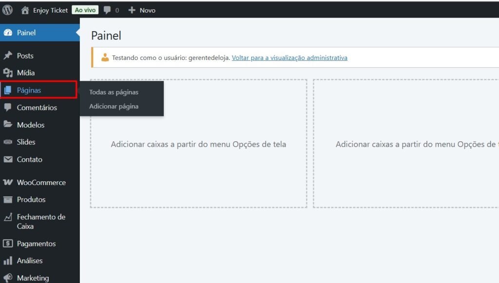 Para editar os sliders da homepage acesse a aba “páginas” na barra lateral preta.