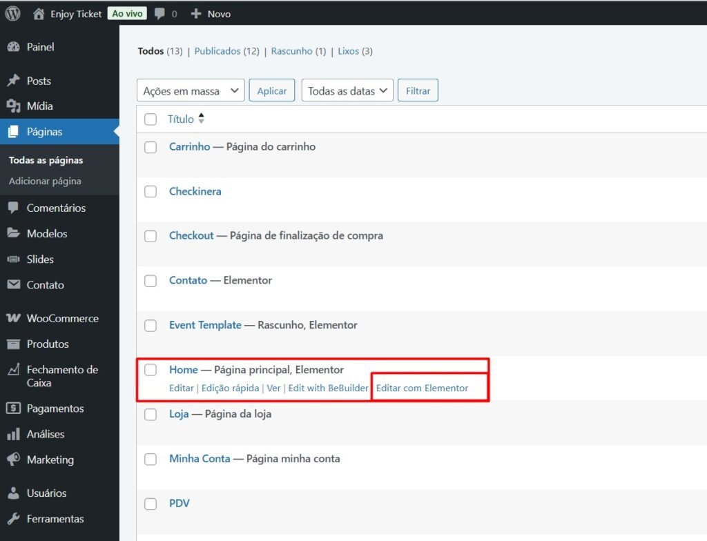 Depois, ache a página chamada “Home” e clique em “editar com elementor”.