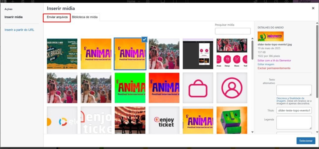 Ao clicar na imagem, uma janela de “Inserir mídia” vai abrir, clique em “Enviar Arquivos” e depois no botão de selecionar arquivos, e escolha a imagem dentro do seu computador.