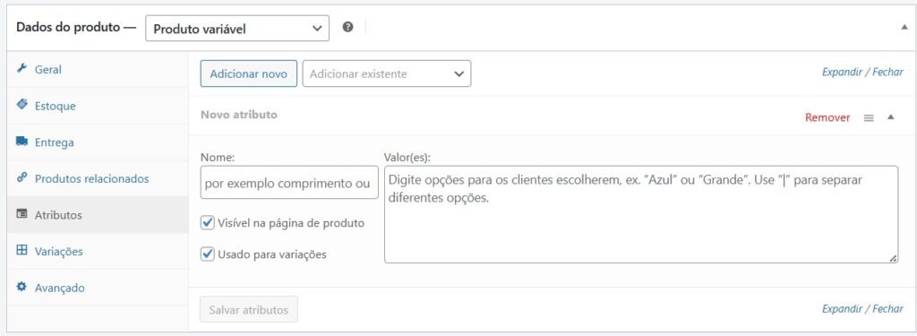 Mantenha as opções de “visível na página do produto” e “usado para variações” marcadas.
