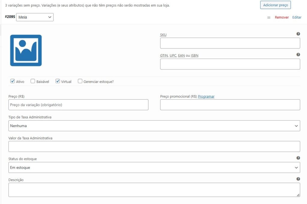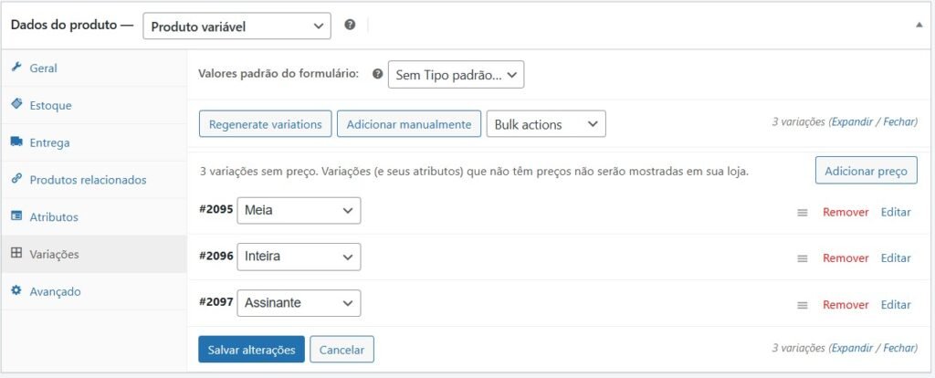 As variações serão geradas. Agora clique em cada uma para expandir e preencha os valores de preço, preço promocional, e taxa administrativa.
